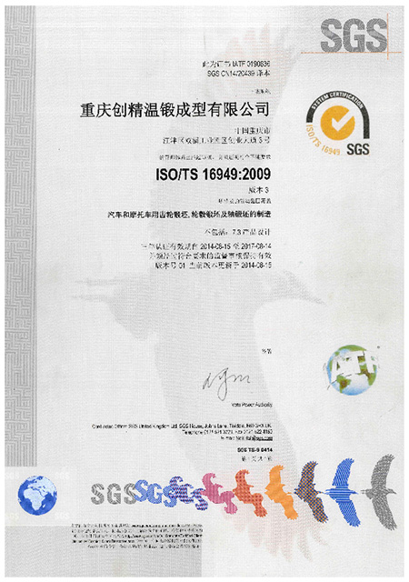 重庆创精温锻成型有限公司自2003年通过ISO9001-2000质量体系认证,2007年通过ISO/TS16949质量体系认证并于2014年通过SGS国际认证服务公司的复评认证,并获得最新版证书。